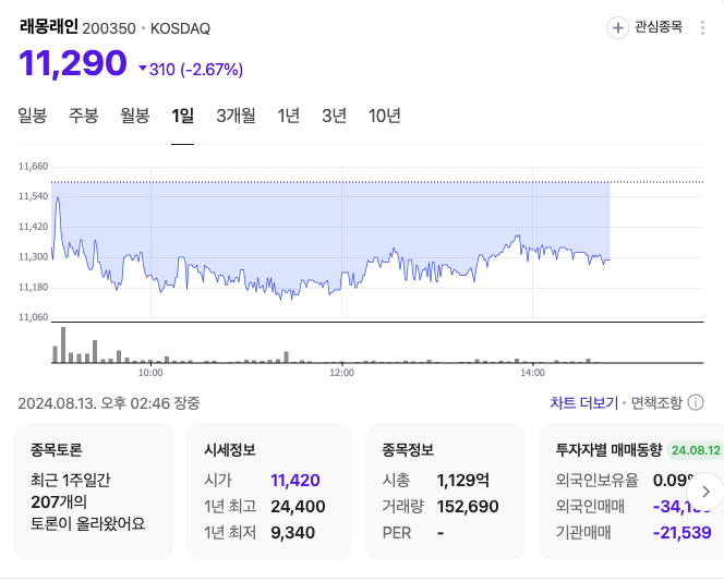 래몽래인 주가는 전 거래일보다 3.62% 하락한 1만1180원에 거래 중입니다.
