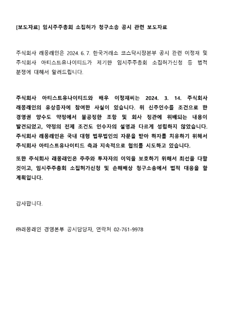 이정재 이사 측의 래몽래인 지분 취득이 무효화될 가능성이 있기 때문입니다.